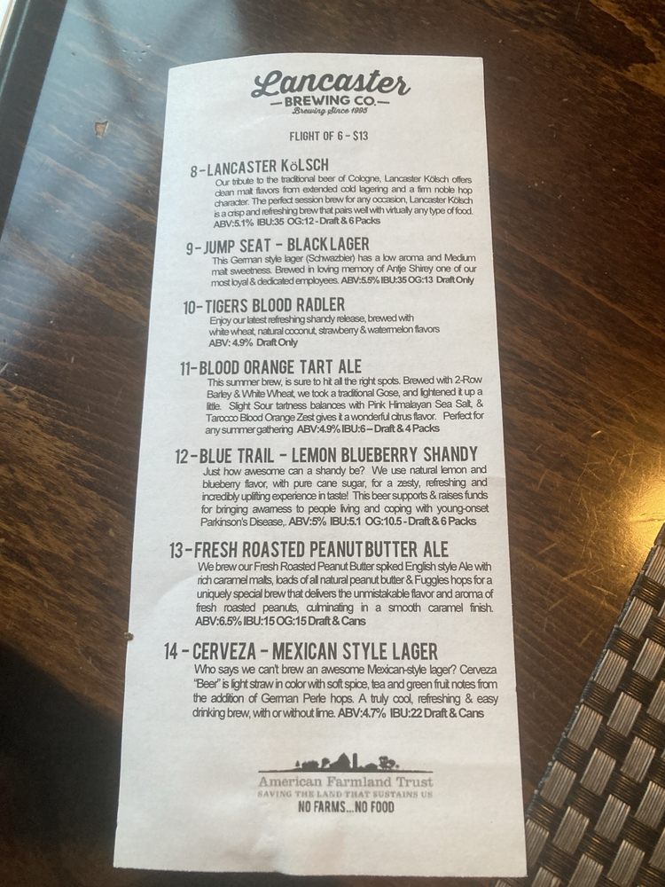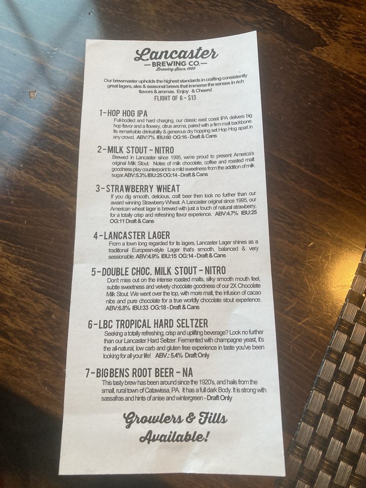 Lancaster Brewing Company Menu